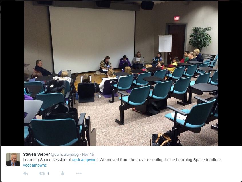 Now, for the most amazing part of EdCamp… we walked into our rooms… and we talked. All of us. There were educational conversations going on throughout the entire room, some side conversations, a collaborative Google Doc with additional conversation, as well as a discussion on Twitter. It was an immersion into all that is awesome about education. I attended sessions on Augmented Reality, Learning Spaces, MakerSpaces, and Game-Based Learning/Gamification. My favorite was Learning Spaces which became facilitated by Steven Weber (@curriculumblog); we walked into an amphitheater classroom and saw the immediate irony of discussing learning spaces in a space that was one of the worst learning spaces of all. Rather than sit in the seats, we all grabbed pillows and went to the bottom of the amphitheater and sat on the floor.